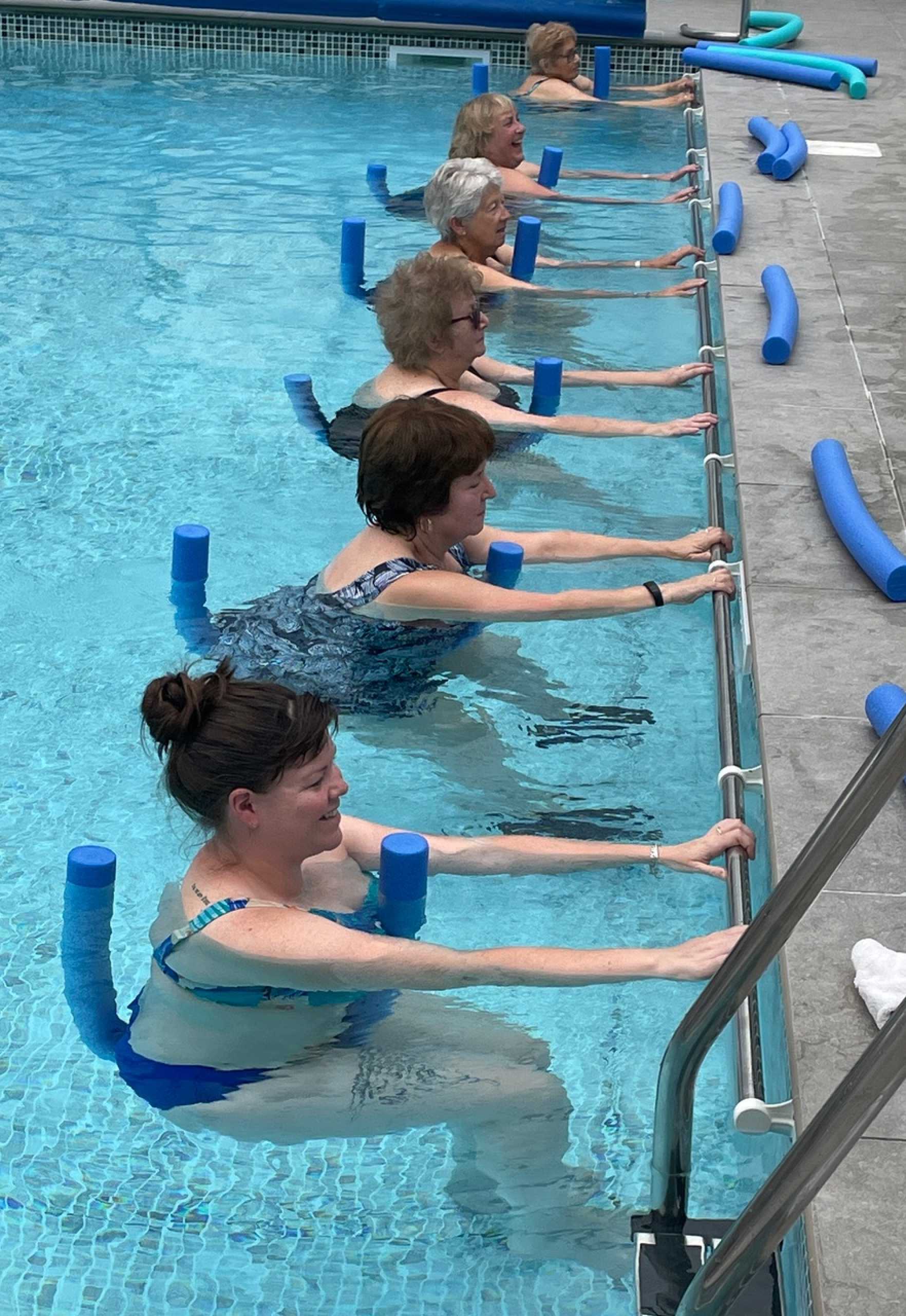 Aqua Cycle / Yoga - cycling on the noodle, either holding the side or an additional noodle, interspersed with yoga exercises. Great for core balance, hip and knee issues, mobility and stability problems.