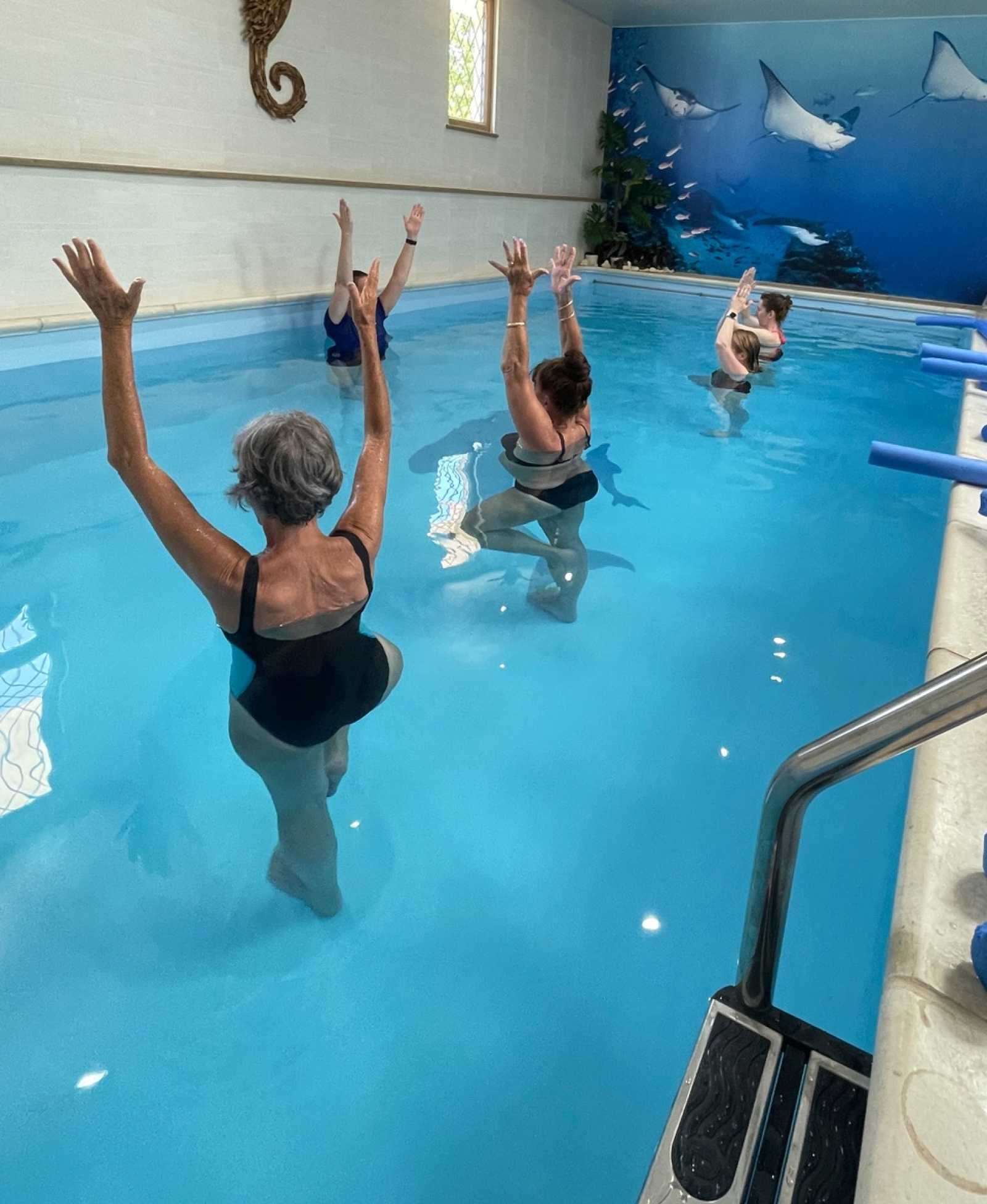 Aqua March - gentle walking and marching exercises designed for stability and mobility issues, pre and post op, and lower body problems with knees / hips / ankles. Also good for those who have breathing difficulties - copd, long covid etc.