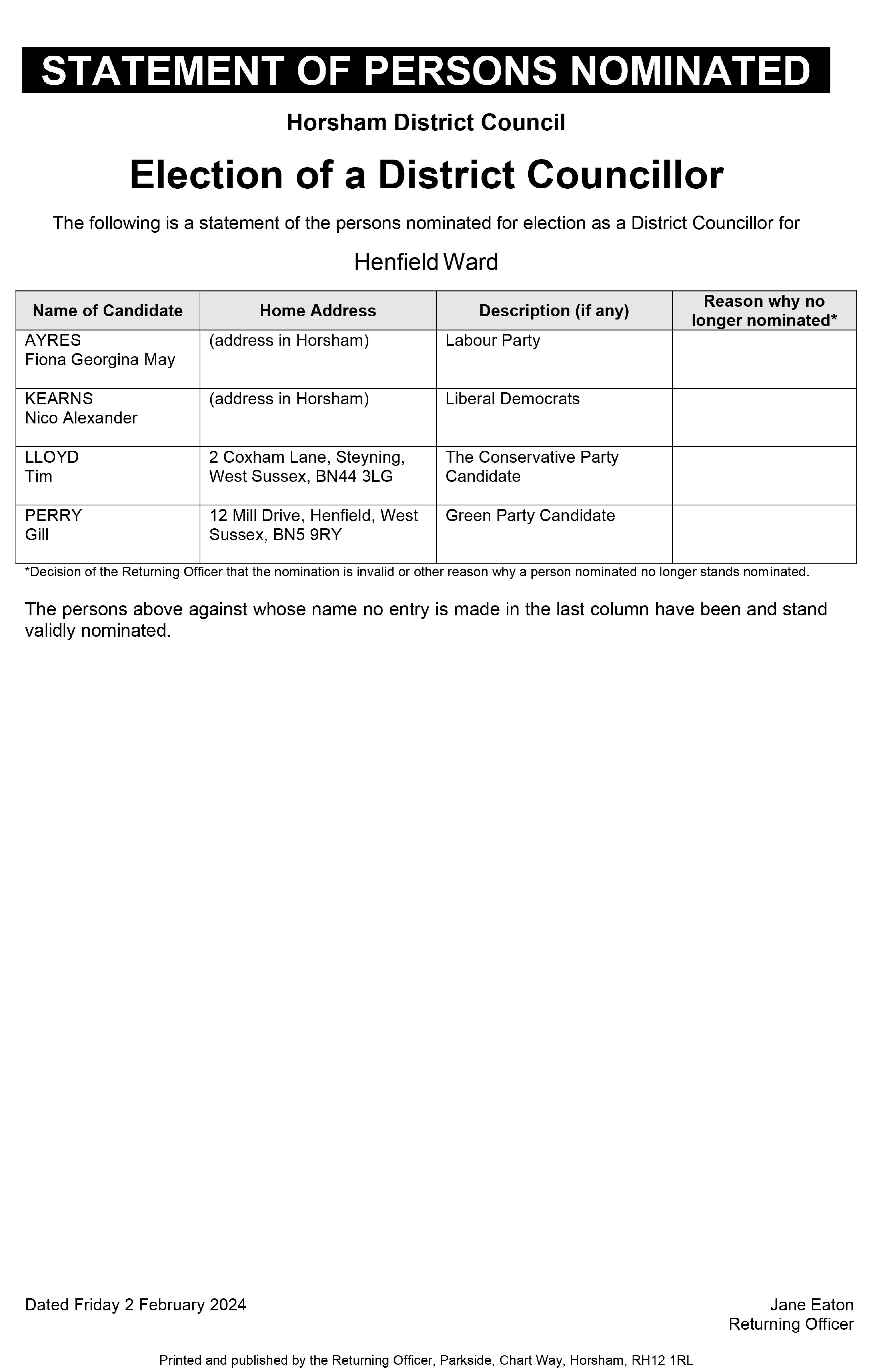 A by-election for Henfield's representative at Horsham District Council takes place on Thursday 19 February. You will need photo ID to vote.
