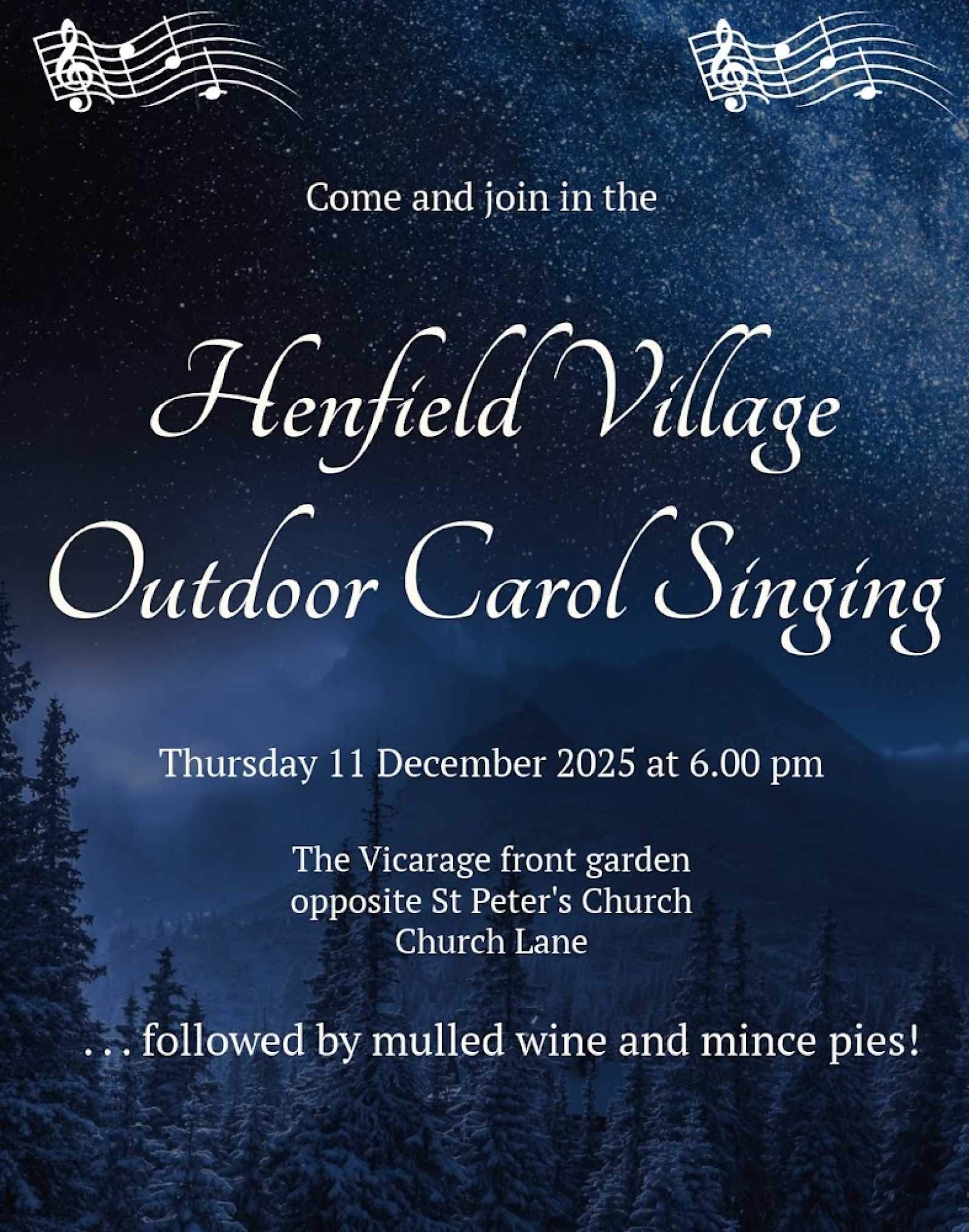 Come and join in the Henfield Village Outdoor Carol Singing on Thursday 11 December at 6.00 pm in the Vicarage front garden (opposite St Peter's Church on Church Lane).