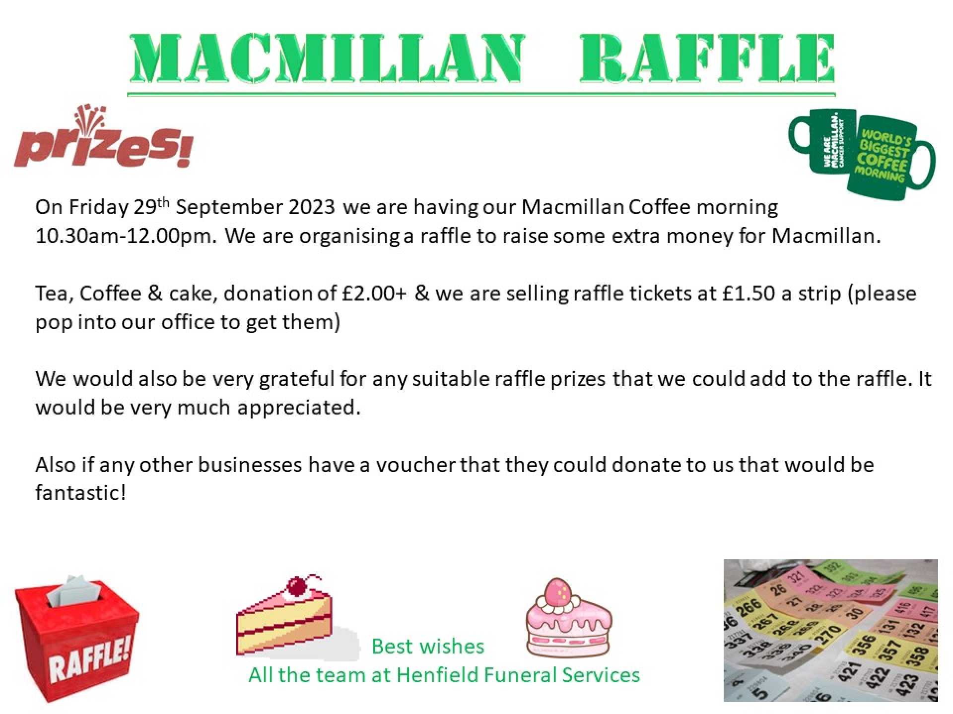 On Friday 29th September 2023 we are having our Macmillan Coffee morning, 10.30am-12.00pm. We are organising a raffle to raise some extra money for Macmillan.