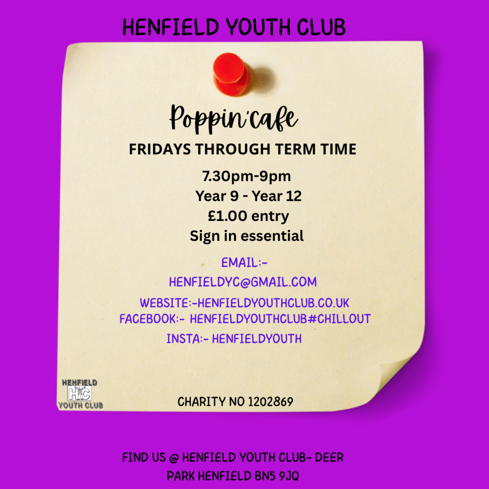 Henfield Youth Club's 'Poppin' Café' runs on Fridays during term times. For young people from year 9 to 12, situated in the Youth Club building in Deer Park.