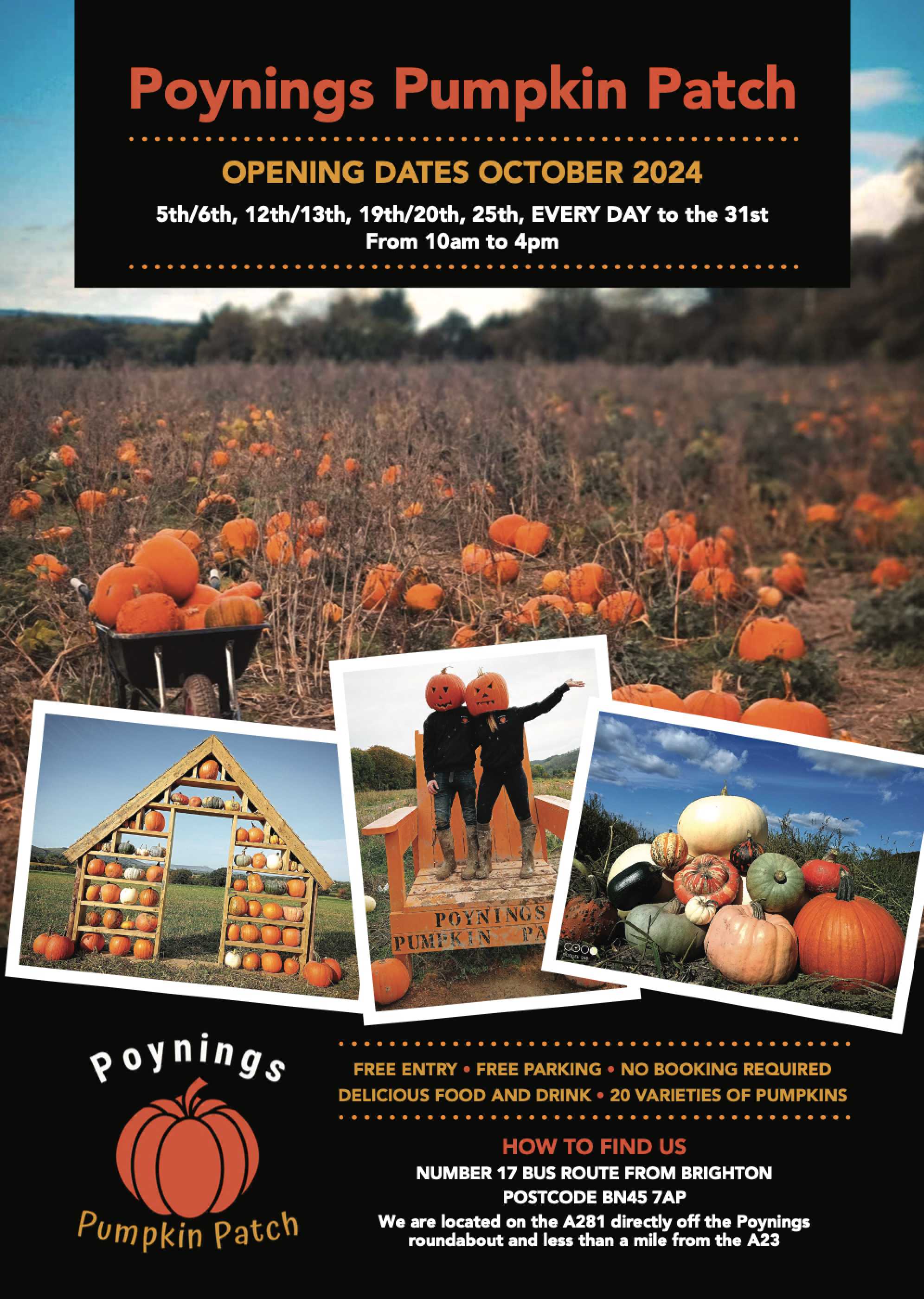 Pick your pumpkin, squash or gourds from 19 varieties. Local hot refreshments. Free entry, free parking, just pay for what you pick. Lots of wheelbarrows to fill!