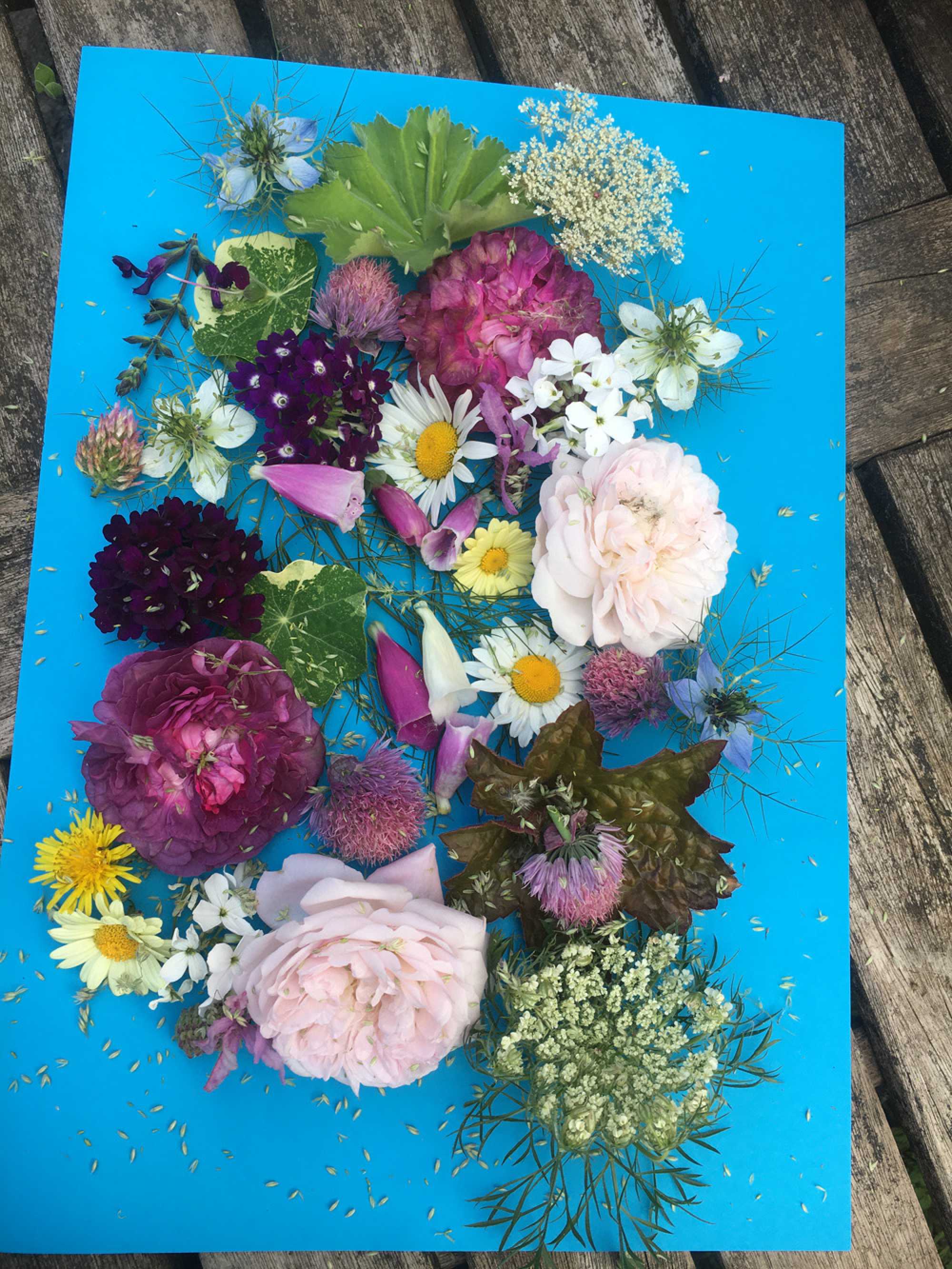 Suzanne Harrison: “Here are some pictures of my grandchildren on a socially distanced visit using the many of the different shapes and colours from my garden to create pieces of art.”