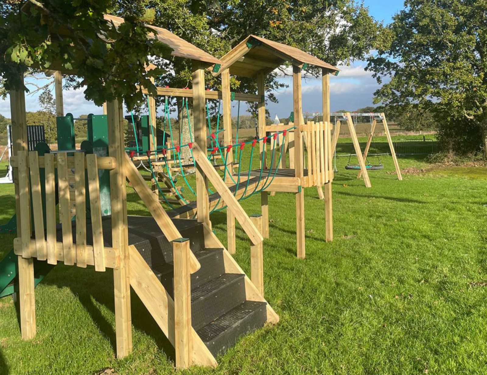 The playground has soft safety matting under the swings and features a discovery tower and climbing frame, overhead grab bars, and with a basket swing for the very youngest. The area will be surrounded by a picket fence before the end of the year and will also contain picnic benches for the summer.